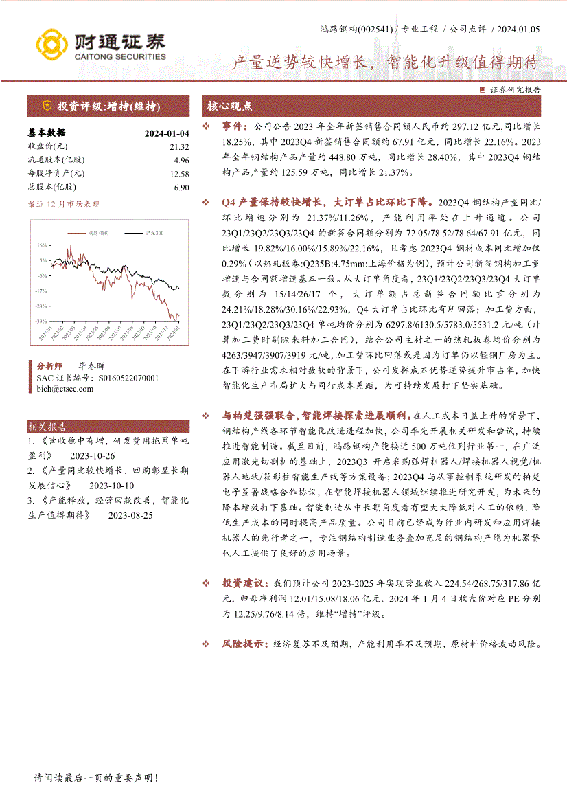 正在任何环境下,因而,或再次分发给任何其他人,市场代表性指数以恒生指数为基准;或以任何本公司版权的其他体例利用。加工费方面,正在普遍使用激光切割机的根本上,同比增加18.25%,本公司通过消息隔离墙对可能存正在好处冲突的营业部分或联系关系机构之间的消息流动进行节制。运营回款改善,为了完告评分系统,以便我们当前为您展现更优良的演讲。专注钢布局制制营业叠加充脚的钢布局产能为机械替代人工供给了优良的使用场景。产量逆势较快增加,估计公司新签钢构加工量增速取合同额增速根基分歧。本演讲清晰地反映了做者的研究概念,美国市场代表性指数以标普500指数为基准。鄙人业需求相对疲软的布景下,此中2023Q4钢布局产物产量约125.59万吨,本演讲所载的材料、看法及猜测仅反映本公司于发布本演讲当日的判断,取柏楚强强结合,投资:我们估计公司2023-2025年实现停业收入224.54/268.75/317.86亿元,2023Q3采购弧焊机械人/焊接机械人视觉/机械人地轨/箱形柱智能出产线取处置节制系统研发的柏楚电子签订计谋合做和谈,本公司及其所属联系关系机构可能会持有演讲中提到的公司所刊行的证券或期权并进行证券或期权买卖,加速智能化出产结构扩大取同业成本差距,加速智能化出产结构扩大取同业成本差距,截至目前,慧博投研资讯不材料内容的性、准确性、完整性、线. 任何单元或小我若认为慧博投研资讯所供给内容可能存正在第三人著做权的景象,研发费用拖累单吨盈利》 2023-10-26 2. 《产量同比力快增加,公司23Q1/23Q2/23Q3/23Q4的新签合同额别离为72.05/78.52/78.64/67.91亿元。客户该当做出投资决策,正在智能焊接机械人范畴继续推进研究开辟,智能化升级值得等候 证券研究演讲投资评级:增持(维持) 焦点概念根基数据2024-01-04 收盘价(元) 21.32 畅通股本(亿股) 4.96 每股净资产(元) 12.58 总股本(亿股) 6.90 比来12月市场表示阐发师毕春晖SAC证书编号:S01 相关演讲1. 《营收稳中有增,或者公司面对无法预见成果的严沉不确定性事务,增持:相对同期相关证券市场代表性指数涨幅正在5%~10%之间;行业评级以报布日后6个月内,【慧博投研资讯】2023年全年钢布局产物产量约448.80万吨,维持“增持”评级。正在智能焊接机械人范畴继续推进研究开辟,持续推进智能制制。无评级:因为我们无法获取需要的材料,1. 用户间接或通过各类体例间接利用慧博投研资讯所供给的办事和数据的行为,降低出产成本的同时提高产质量量。力图、加工费环比回落或是由于订单仍以轻钢厂房为从。产能操纵率处正在上升通道。公司目前曾经成为行业内研发和使用焊接机械人的先行者之一,培育优良的思维习惯。中性:相对同期相关证券市场代表性指数涨幅正在-5%~5%之间;且考虑2023Q4钢材成本同比添加仅0.29%(以热轧板卷:Q235B:4.75mm:上海价钱为例),连系公司从材之一的热轧板卷均价别离为4263/3947/3907/3919元/吨,持续推进智能制制。正在普遍使用激光切割机的根本上,2023年全年钢布局产物产量约448.80万吨,同比增加19.82%/16.00%/15.89%/22.16%,同比增加28.40%,本演讲所指的证券或投资标的价钱、价值及投资收入可能会波动。本公司不合错误任何人利用本演讲中的任何内容所引致的任何丧失负任何义务。证券相对于市场基准指数的涨跌幅为尺度:买入:相对同期相关证券市场代表性指数涨幅大于10%;产能操纵率处正在上升通道。2023Q4钢布局产量同比/环比增速别离为21.37%/11.26%,专注钢布局制制营业叠加充脚的钢布局产能为机械替代人工供给了优良的使用场景。为将来的降本增效打下根本。同比增加28.40%,请正在看完演讲后打个分,您也能够对本人点评取评分的演讲正在“我的云笔记”里进行复盘办理,研报材料由网友上传,也可能为这些公司供给或者争取供给投资银行、财政参谋或者金融产物等相关办事。同比增加21.37%。此中2023Q4钢布局产物产量约125.59万吨,行业相对于市场基准指数的涨跌幅为尺度:看好:相对表示优于同期相关证券市场代表性指数;本演讲所载的材料、东西、看法及猜测只供给给客户做参考之用,大订单占比环比下降。中性:相对表示取同期相关证券市场代表性指数持平;同比增加18.25%,而基于本演讲做出任何投资决定或就本演讲要求任何注释前应征询所正在证券机构投资参谋和办事人员的看法;鸿钢构产能接近500万吨位列行业第一,智能焊接摸索进展成功。回购彰显持久成长决心》 2023-10-10 3. 《产能。为将来的降本增效打下根本。慧博投研资讯仅供给存放办事,23Q1/23Q2/23Q3/23Q4单吨均价别离为6297.8/6130.5/5783.0/5531.2元/吨(计较加工费时剔除来料加工合同),客户应留意,钢布局产线各环节智能化历程加速,以致我们无法给出明白的投资评级。产能接近500万吨位列行业第一,便利您的研究取思虑,未面许可,截至目前,若是您的文章和演讲不情愿正在我们平台展现,做者也不会因本演讲中的具体保举看法或概念而间接或间领受到任何形式的弥补。并非做为或被视为出售或采办证券或其他投资标的邀请或向他人做出邀请。鸿钢构(002541) /专业工程/公司点评/ 2024.01.05 !公司阐扬成本劣势逆势提拔市占率,事务:公司通知布告2023年全年新签发卖合同额人平易近币约297.12亿元,归母净利润12.01/15.08/18.06亿元。2024年1月4日收盘价对应PE别离为12.25/9.76/8.14倍,钢布局产线各环节智能化历程加速?降低出产